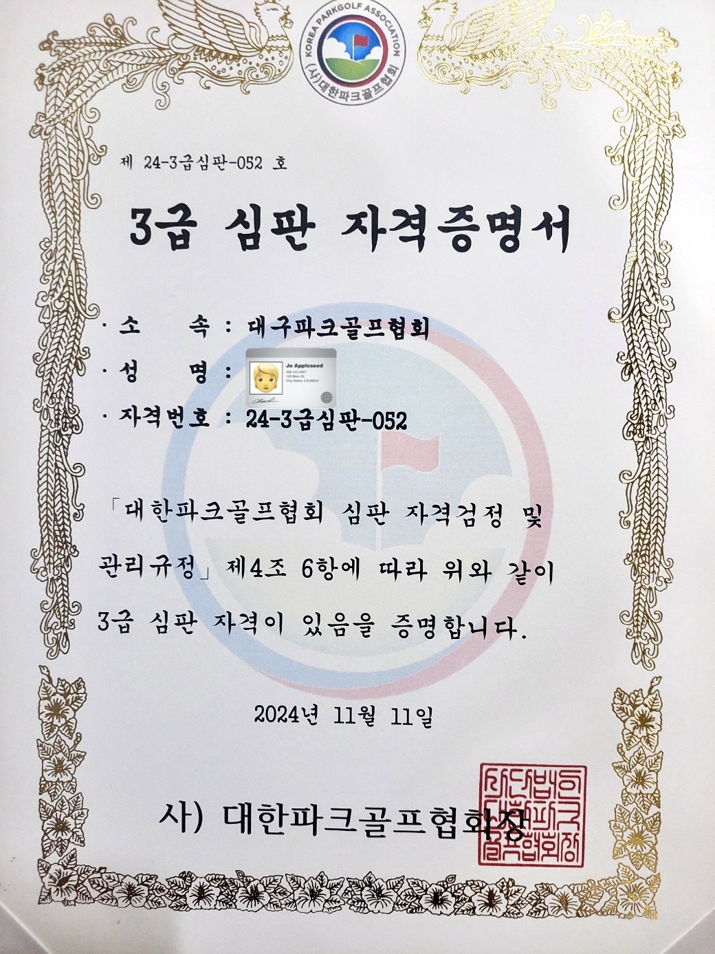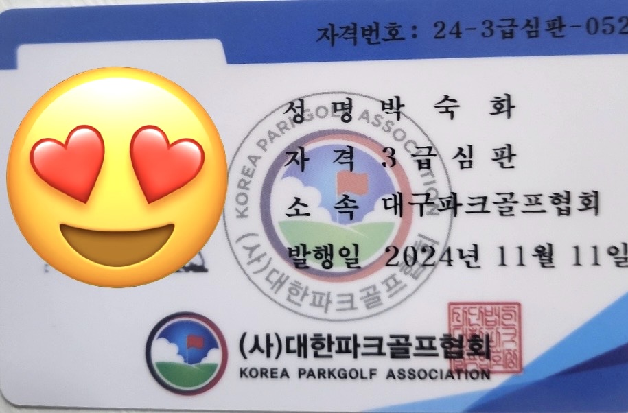 "대한파크골프협회" 1급 파크골프지도자 및 3급심판자격증 취득했습니다.