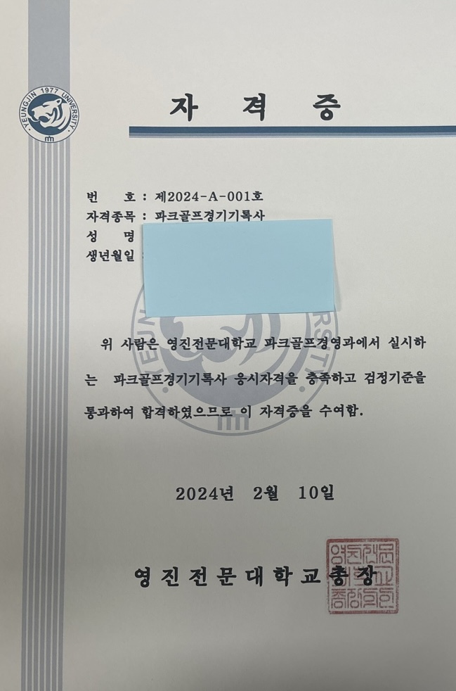 영진전문대 총장명의로 발급되는 이자격증은 파크골프경영과에서 파크골프를 전문적 · 체계적으로 배우고, 파크골프 산업과 비즈니스에 대한 이해를 위해 경영 기초 과목을 이수를 하면 취득 할 수 있는